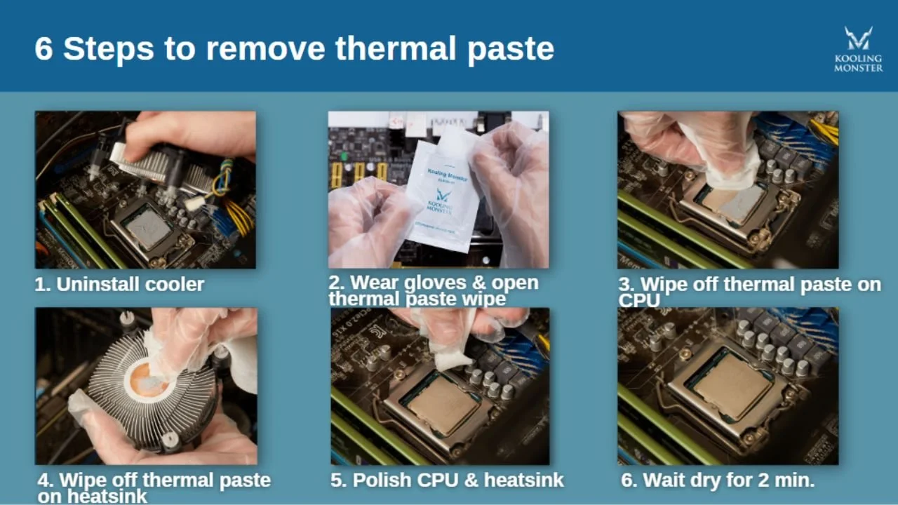 Wische die Wärmeleitpaste von deiner CPU/GPU und dem Kühlkörper mit einem Reinigungstuch ab.