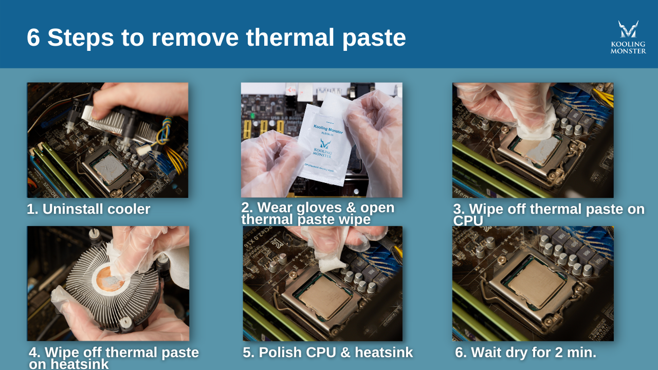 Mit einem professionellen Reinigungstuch für Wärmeleitpaste wie Kooling Monster KLEAN-01 kannst du sicherstellen, dass deine CPU oder GPU bereit für einen frischen Auftrag Wärmeleitpaste ist und deine Komponenten kühl und leistungsstark bleiben. Die Tücher sind super sauber, sicher für elektronische Komponenten und können sogar ausgetrocknete Wärmeleitpaste mühelos reinigen. Sie bieten eine einfache und effiziente Lösung, ohne deine Komponenten zu beschädigen. (Mehr dazu unter Wie man eine CPU entfernt und reinigt)