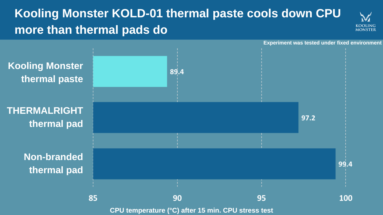 Wärmeleitpaste übertrifft Wärmeleitpads deutlich bei der Aufrechterhaltung der thermischen CPU-Effizienz. Während eines Stresstests hielt Kooling Monster KOLD-01 Wärmeleitpaste die CPU-Temperatur um etwa 8 °C niedriger als ein Marken-Wärmeleitpad und sorgte damit für bessere CPU-Leistung.