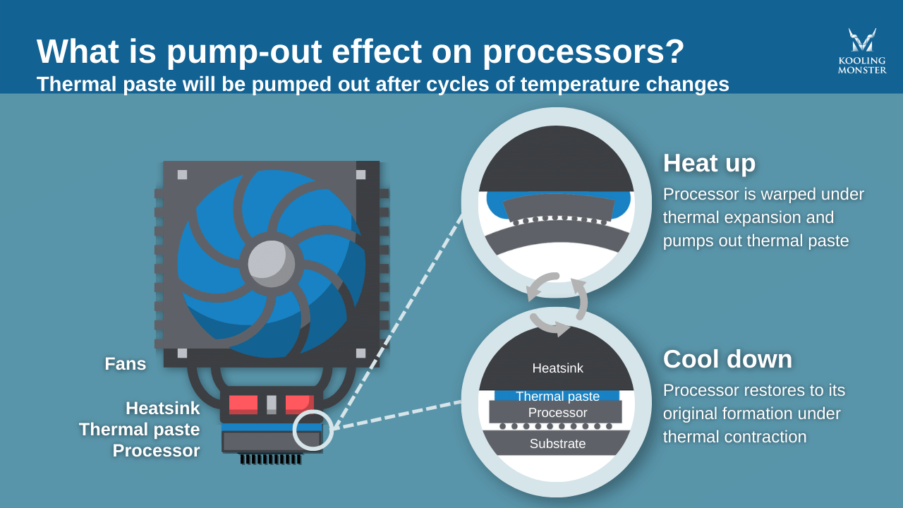 Kurz gesagt: Pump-out bedeutet, dass die Paste aus dem zentralen Prozessor herausgepumpt wird. Das passiert bei Temperaturänderungen, wenn sich Substrat und Prozessor auf mikroskopischer Ebene verformen und die Paste allmählich nach außen bewegen. Prozessoren durchlaufen viele Zyklen, in denen sie heiß werden und dann abkühlen.