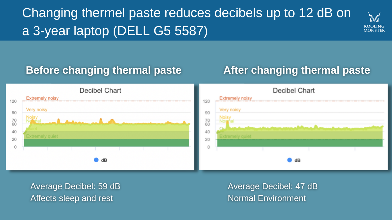 Wir haben die Lüfterlautstärke eines 3 Jahre alten Laptops vor und nach dem Auftragen neuer Wärmeleitpaste gemessen.