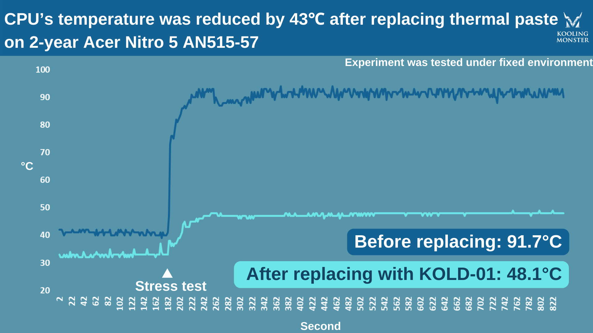 Um das zu verdeutlichen, haben wir Stresstests an einem 2 Jahre alten Acer Nitro 5 AN515-57 durchgeführt — vor und nach dem Auftragen neuer Wärmeleitpaste. Verwendet haben wir unsere eigene Kooling Monster KOLD-01 Wärmeleitpaste.