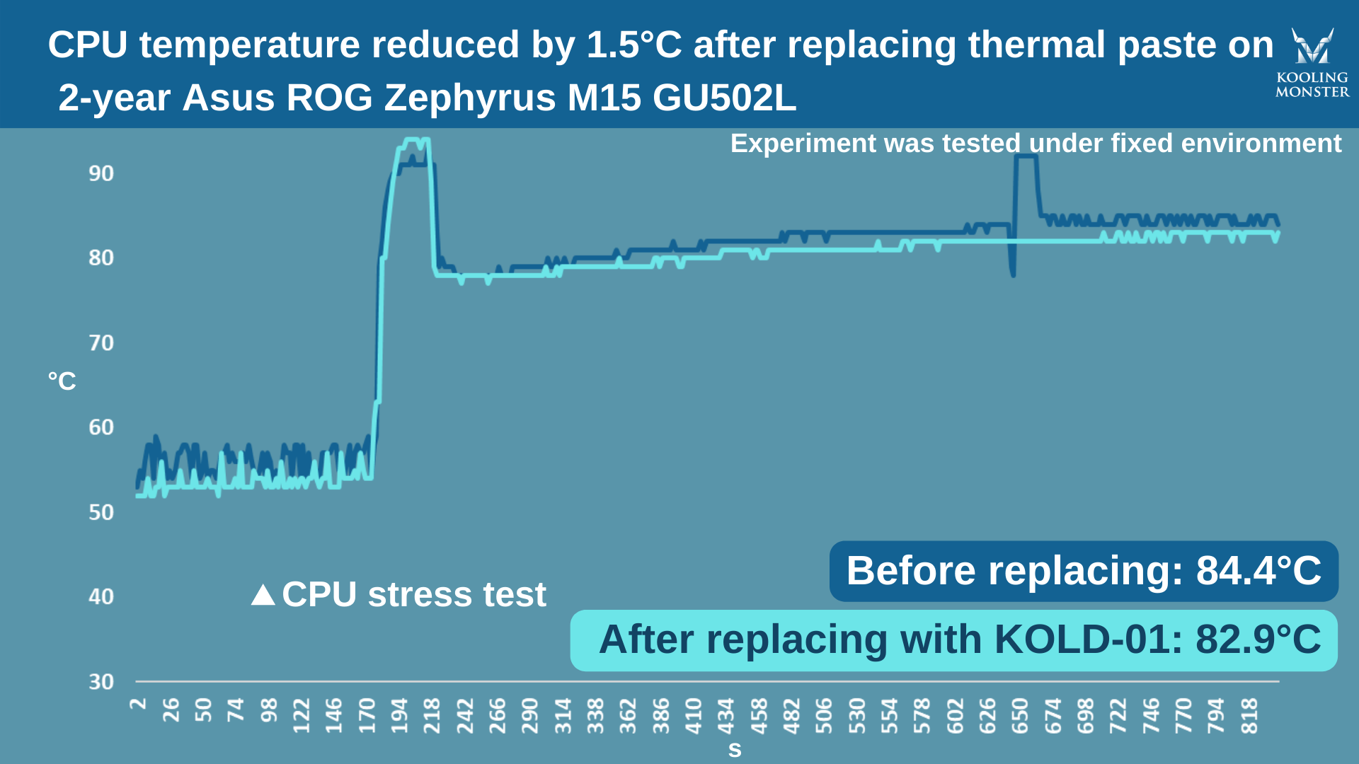 Um das zu verdeutlichen, haben wir Stresstests an einem 2 Jahre alten Asus ROG Zephyrus M15 GU502L durchgeführt — vor und nach dem Auftragen neuer Wärmeleitpaste. Verwendet haben wir unsere eigene Kooling Monster KOLD-01 Wärmeleitpaste.