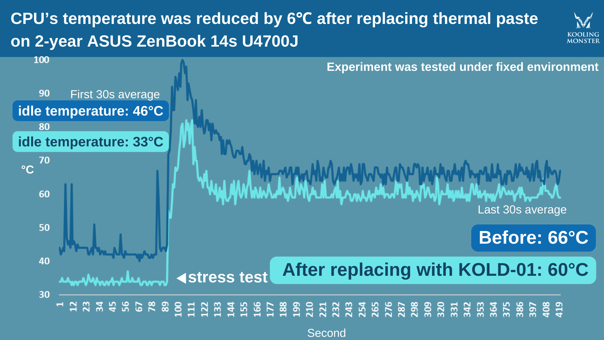 Um das klarer zu machen, haben wir auf einem 2 Jahre alten ASUS ZenBook 14s U4700J Stresstests durchgeführt — vor und nach dem Auftragen der neuen Wärmeleitpaste. Dafür haben wir unsere eigene Kooling Monster KOLD-01 Wärmeleitpaste verwendet.