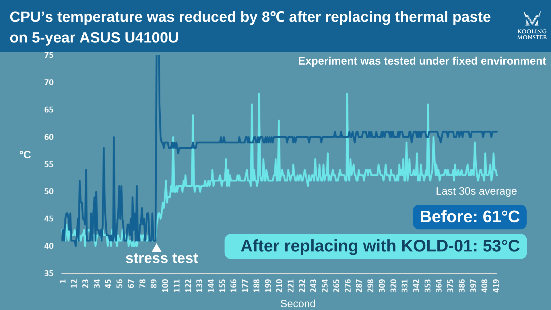Um das klarer zu machen, haben wir auf einem 5 Jahre alten ASUS ZenBook U4100U Stresstests durchgeführt — vor und nach dem Auftragen der neuen Wärmeleitpaste. Dafür haben wir unsere eigene Kooling Monster KOLD-01 Wärmeleitpaste verwendet.