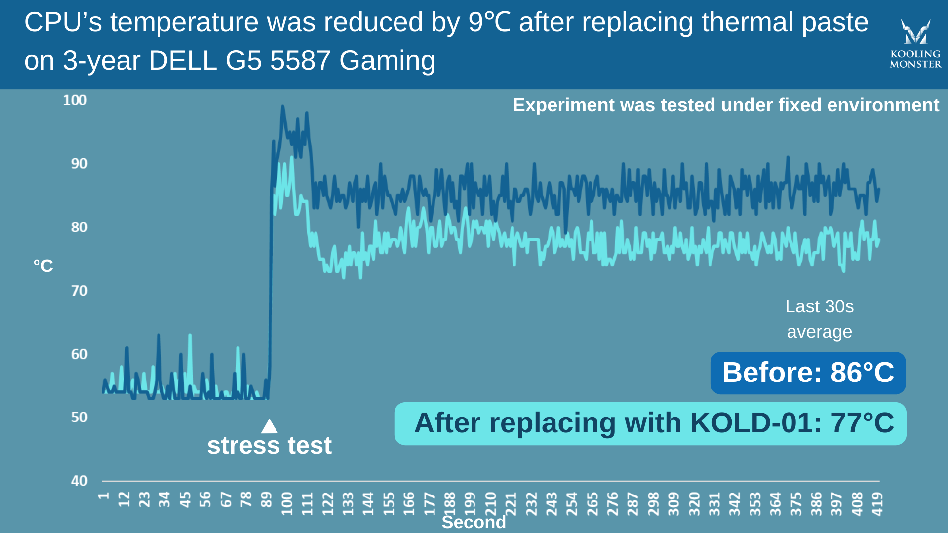 Um das klarer zu machen, haben wir auf einem 3 Jahre alten Dell G5 5587 Gaming Stresstests durchgeführt — vor und nach dem Auftragen der neuen Wärmeleitpaste. Dafür haben wir unsere eigene Kooling Monster KOLD-01 Wärmeleitpaste verwendet.