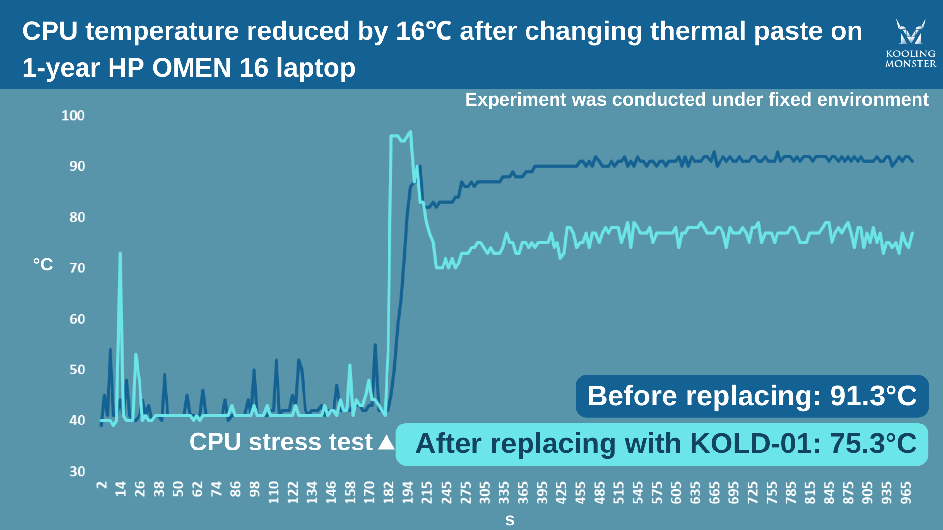 Um das zu verdeutlichen, haben wir Stresstests an einem 1 Jahr alten HP OMEN 16 durchgeführt — vor und nach dem Auftragen neuer Wärmeleitpaste. Verwendet haben wir unsere eigene Kooling Monster KOLD-01 Wärmeleitpaste.