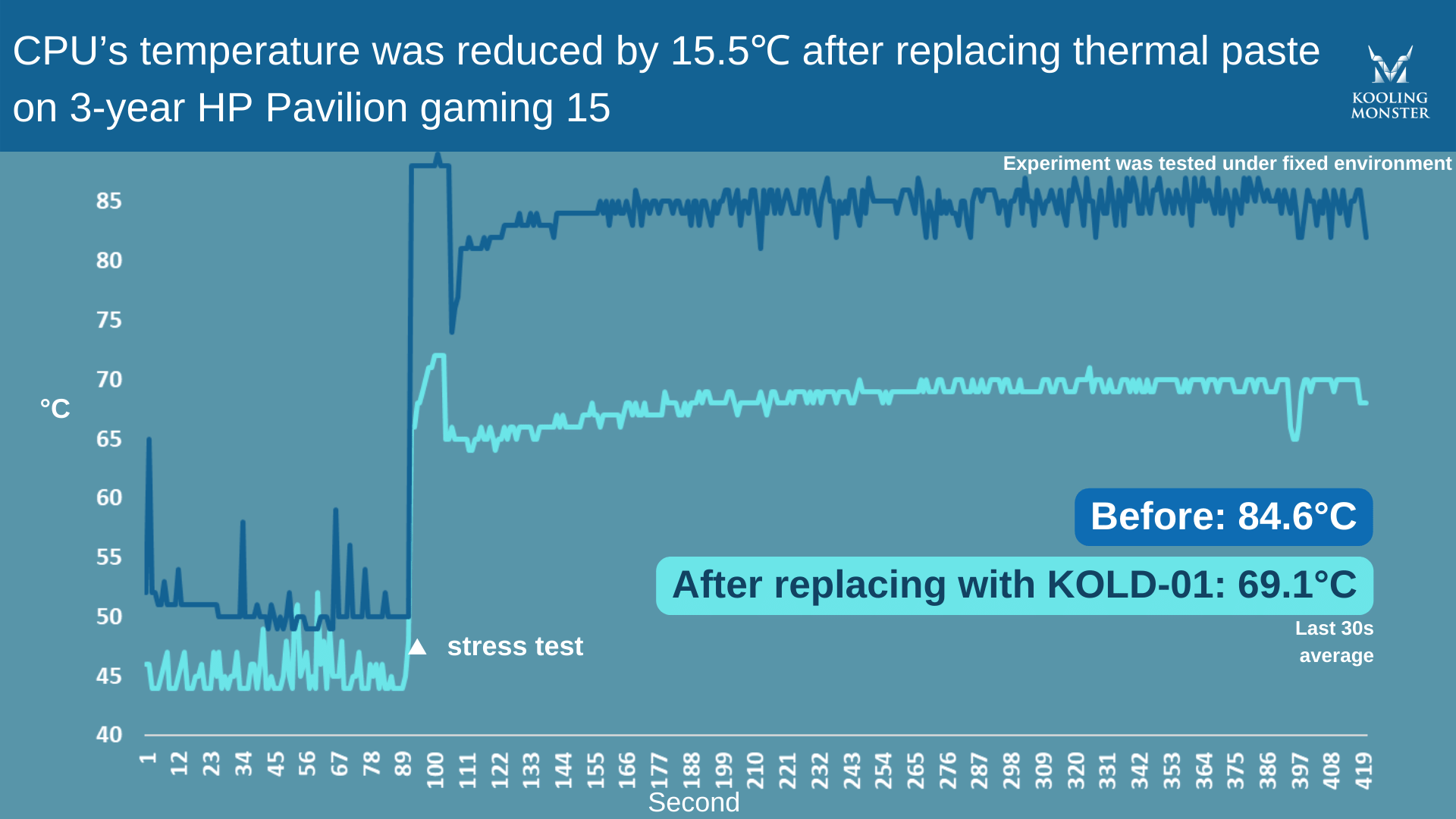 Zur Veranschaulichung haben wir auf einem 3 Jahre alten HP Pavilion Gaming 15 Stresstests vor und nach dem Auftragen neuer Wärmeleitpaste durchgeführt. Für den Test haben wir unsere eigene Kooling Monster KOLD-01 Wärmeleitpaste verwendet.