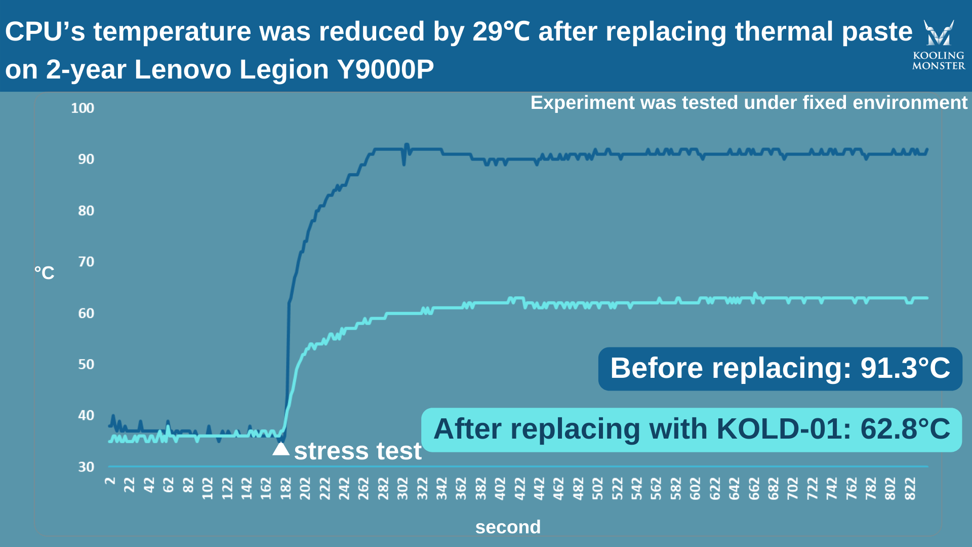 Um das zu verdeutlichen, haben wir Stresstests an einem 2 Jahre alten Lenovo Legion Y9000P 2021H durchgeführt — vor und nach dem Auftragen neuer Wärmeleitpaste. Verwendet haben wir unsere eigene Kooling Monster KOLD-01 Wärmeleitpaste.